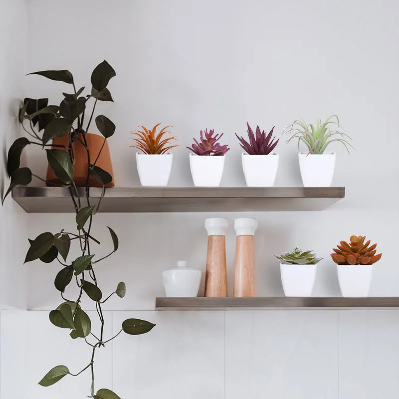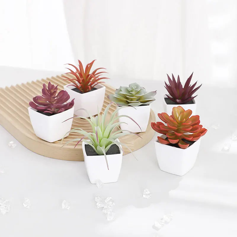 שש יחידות מיני צמח סוקולנט מלאכותי מפלסטיק אגן לבן, מושלם לעיצוב הבית לקישוט מדף הספרים לשולחן העבודה וכל אפשרות אחרת